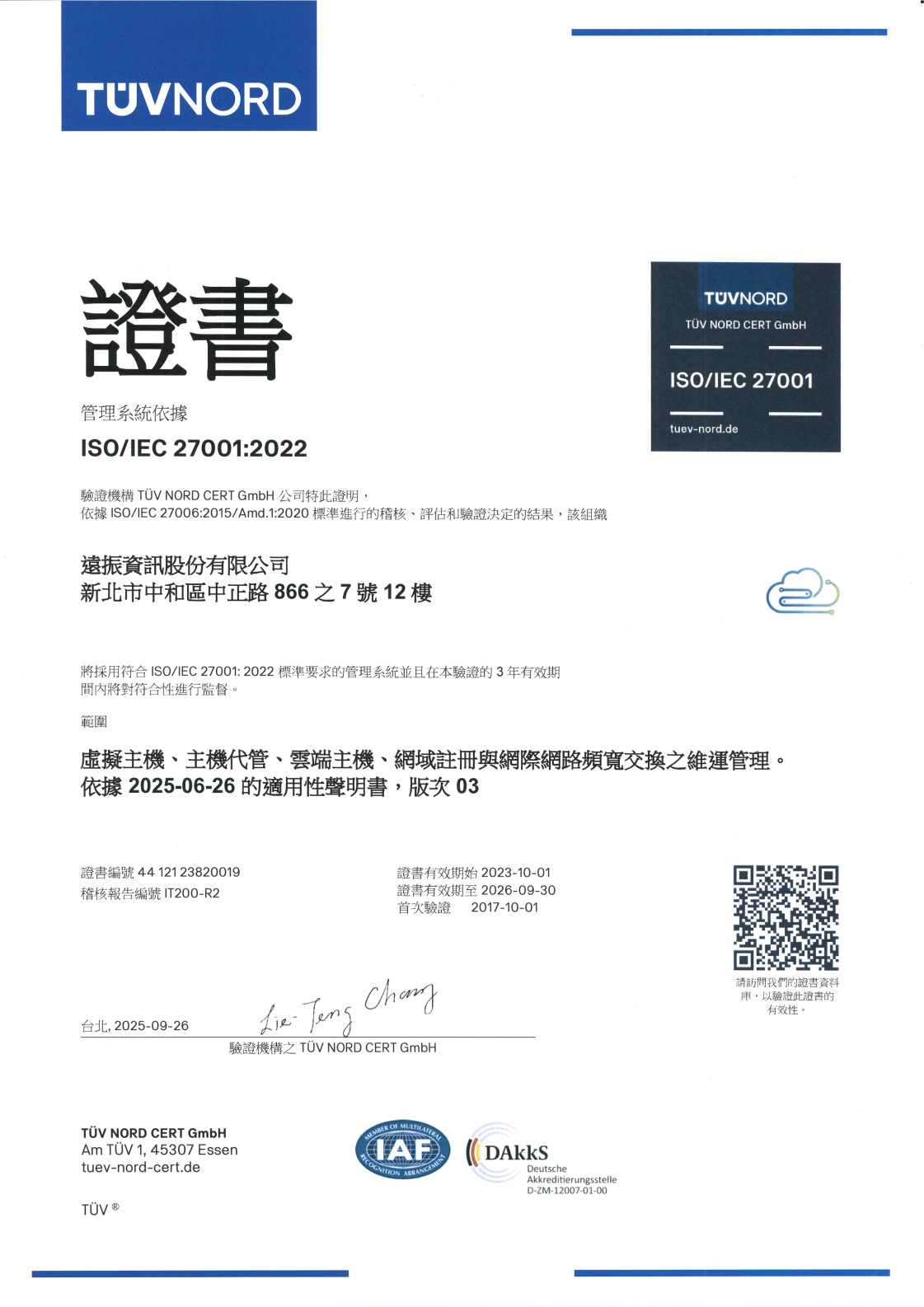 遠振資訊選擇德國 TÜV NORD Group 作為其 ISO 27001 驗證的第三方審查機構。TÜV NORD Group 為總部設於德國漢諾威的國際性獨立機構,自 1988 年起於台灣設立分公司,專注於檢驗、測試及驗證服務。該機構擁有經驗豐富、具備行業認證資格的審核員團隊,多數審核員擁有超過 15 年的實務經驗,並受到德國政府授權與監管,具高度專業性與公信力。
