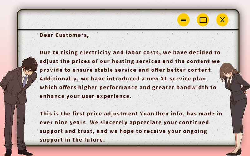 This is the first price adjustment YuanJhen info. has made in over nine years. We sincerely appreciate your continued support and trust, and we hope to receive your ongoing support in the future.
