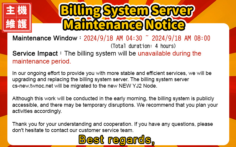 In our ongoing effort to provide you with more stable and efficient services, we will be upgrading and replacing the billing system server. The billing system server cs-new.twnoc.net will be migrated to the new NEW YJ2 Node.